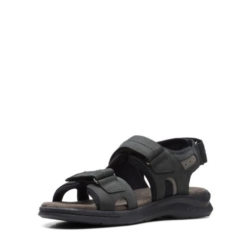 Clarks Sandals Black Nubuck Hapsford Trail A heritage-inspired design with outdoor influence, the Hapsford Slide sandal combines comfort with ground-breaking technology in its cushioned footbed and flexi sole. The result is a versatile profile that looks stylish in black nubuck.