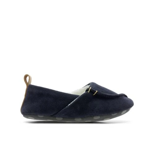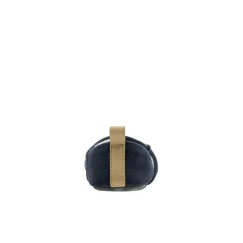 Maven Park, babies slippers, navy suede – With mini-me inspiration, these navy suede slippers use an asymmetric stitched seam and chunky stitch details for a distinctive look. A teddy fleece lining offers a cosy feel perfect for colder months, while pods on the sole are both fun and functional. Finished with natural tan leather tabs for easy on and off.